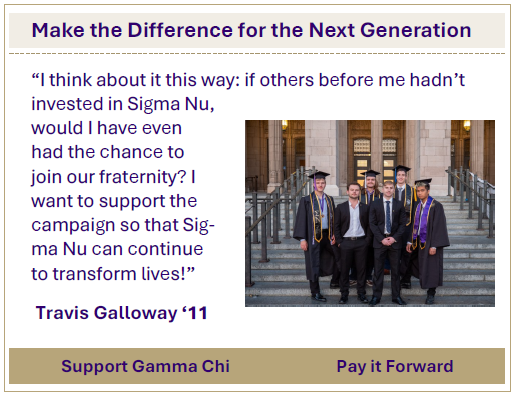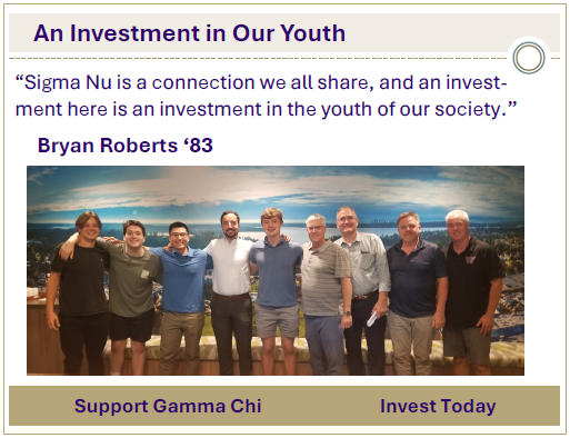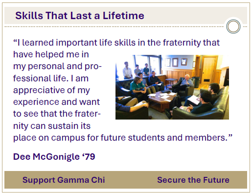 Brotherhood doesn’t end at graduation. Your gift fuels the programs that keep Gamma Chi connected.