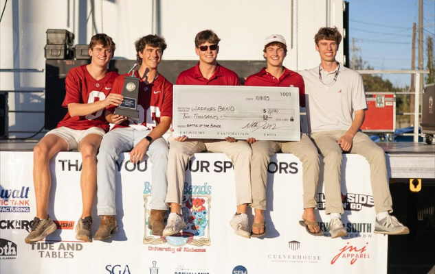 Theta Chapter brothers Luke Jordan (pictured center) and David Brett (pictured far right) and their band, Warriors Bend, are winners of the 2025 Battle of the Bands at the University of Alabama and the first recipients of the new Joe Espy Trophy. The one-day event, held on October 11 and hosted by the Student Government Association along with the Alabama Panhellenic Association and the Interfraternity Council, raised funds for the Joe Espy Needs-Based Scholarship, created to support students facing unforeseen financial hardship.