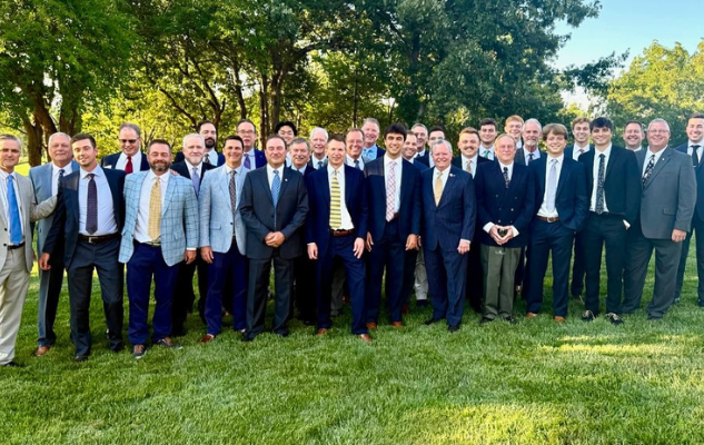 On August 22, alumni and collegiate leaders of the Nu Chapter at the University of Kansas gathered at Hallbrook Country Club in Kansas City for the chapter’s annual Commander’s Dinner. The evening brought together more than 20 alumni and several collegiate officers for fellowship and reflection on the chapter’s continued success. Current Alumnus of the Biennium honoree Mark Mustoe emceed the event, providing updates on the ongoing house renovation project and celebrating recent achievements. Special guests included Past Regent Maury Gaston (Auburn) and Division Commander Jeremy Edwards (Tulsa). Regent Gaston delivered keynote remarks, highlighting Nu Chapter’s historic legacy and notable initiates such as Walter James Sears and Bud Hinkle. The evening concluded with alumni offering words of advice and encouragement to the chapter’s executive council, reinforcing the strong bonds that connect Nu alumni and undergraduates across generations.