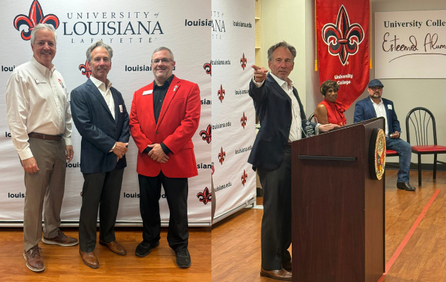 On October 16, Eta Nu Chapter alumnus Mike Fruge was recognized by the University of Louisiana at Lafayette with the Distinguished Alumni Award from the University College. On hand to celebrate Brother Fruge was fellow Eta Nu alumnus Dan Hare (far left), who serves as the university alumni association’s Director of Community Engagement.