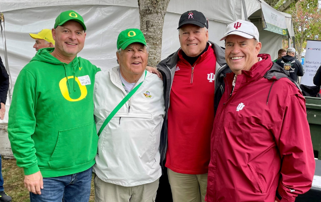 Over the weekend of October 11, the Gamma Zeta Chapter at the University of Oregon celebrated the chapter’s historic 125th chartering anniversary. Regent Steve Ratterman (Indiana) was able to attend the chapter’s festivities and delivered remarks and the anniversary certificate to the chapter. Coinciding with the milestone anniversary was a marquee matchup between the #2 Indiana Hoosiers and #6 Oregon Ducks. Pictured: Alumnus brothers Dan McCarthy (Oregon), Past Regent Dan Rodriguez (Arizona State), Regent Ratterman, and Past Regent E.G. White (Indiana) before the big game.