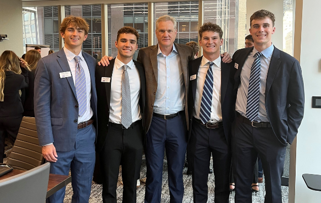 This fall, Lambda Epsilon Chapter brothers Zander Mathes, PJ Carpenter, Chris Taylor, and Charles Seymore participated in a networking trip to New York City as part of the university’s Transaction and Investment Professionals (TIP) program. This exclusive cohort program is designed to prepare sophomores for careers in investment banking. During their visit, the brothers connected with multiple corporate finance firms and networked with TCU alumni, gaining invaluable insights from prominent business leaders. A highlight of the trip was meeting Lambda Epsilon alumnus Jim Spencer, TD Managing Director and Co-Head of the Global Financial Institutions Group (FIG).